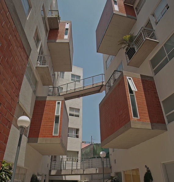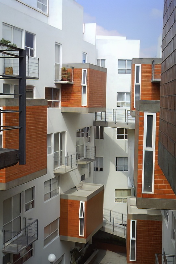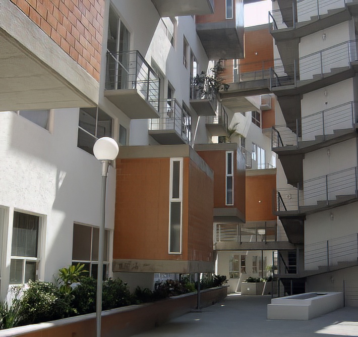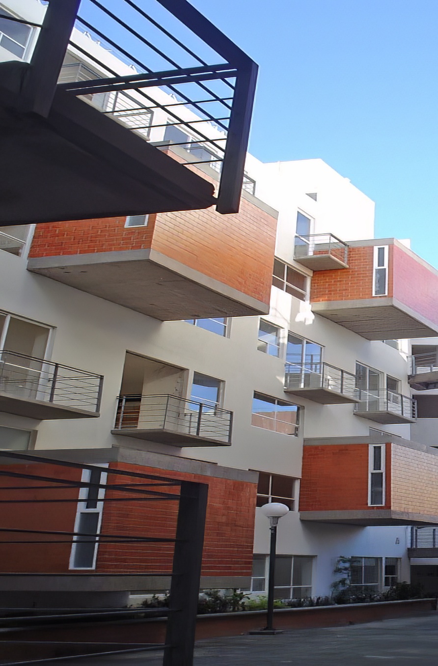 La arquitectura se diseño con departamento de dos niveles, distribuidos en torres de 6 niveles, teniendo acceso a las viviendas por los niveles 1, 3 y 5. Logrando que los servicios se localicen a medio nivel, con esto se genera que las fachadas interiores sean dinámicas. Cuenta con una plaza central con áreas jardinadas y una fuente como punto focal.